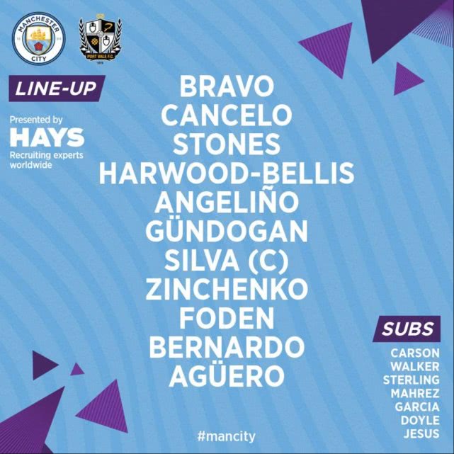 足总杯曼城首发:阿圭罗单箭头 斯通斯伤愈复出