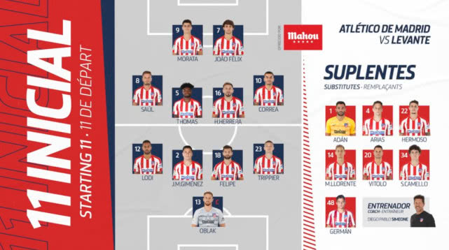 马竞VS莱万特首发:新C罗配莫拉塔 托马斯坐镇中场