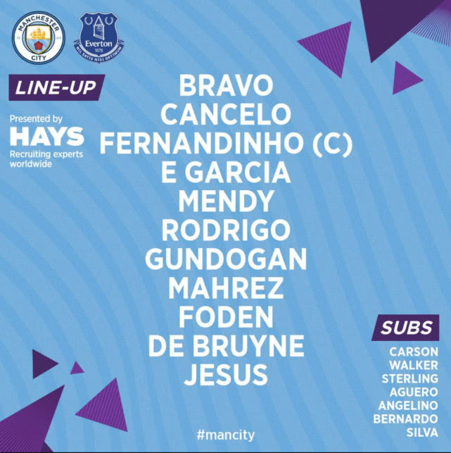 曼城VS埃弗顿首发:热苏斯单箭头 德布劳内领衔中场
