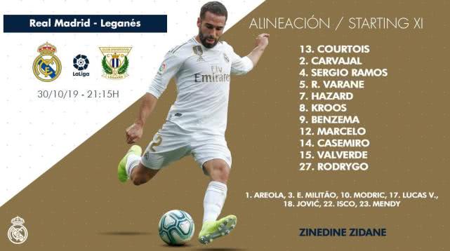 皇马联赛首发:阿扎尔水爷领衔 罗德里戈出战