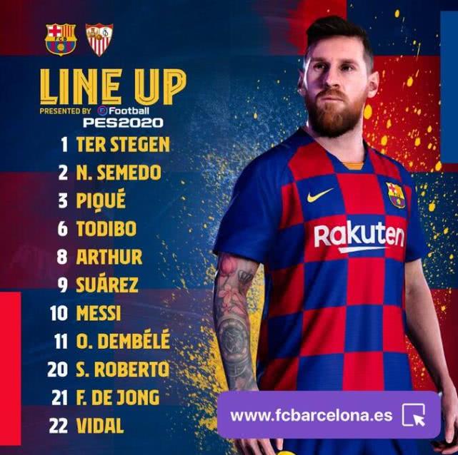 巴萨联赛首发:梅西配苏牙登贝莱 比达尔亮相