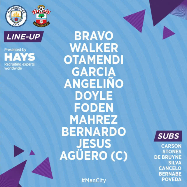 曼城VS南安普敦首发:热苏斯联袂阿圭罗 双核均候补