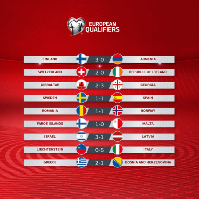 欧预赛综述-意大利5球大胜西班牙绝平 中超双星皆传射
